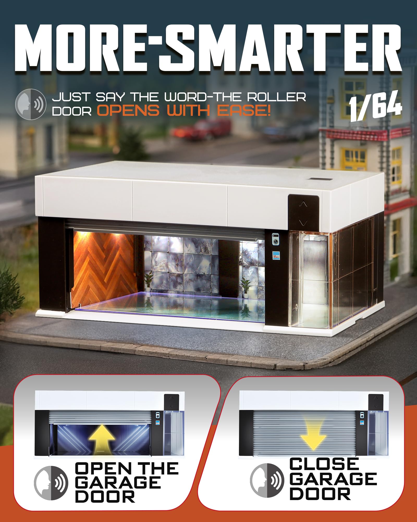- 【Voice & Touch Smart Garage with LED Lights】Open or close the garage door with a simple voice command or touch of a button. Bright LED lights automatically activate, showcasing every detail of your 1:64 scale cars in an eye-catching display.